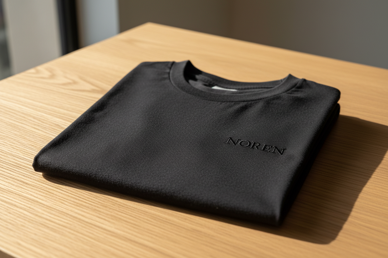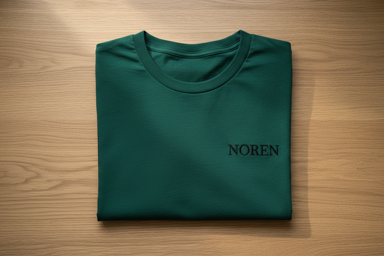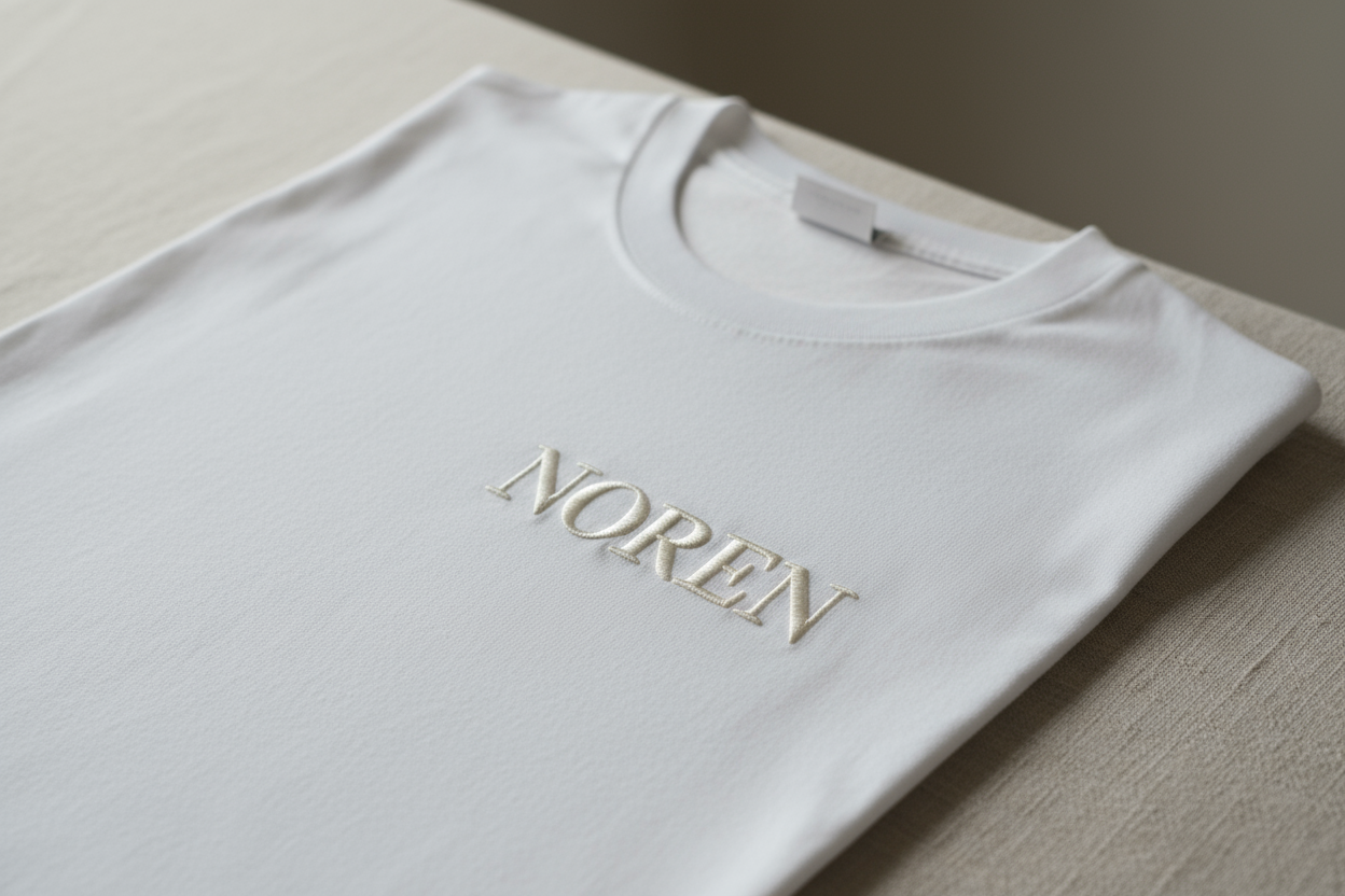 Put a white t shirt with NOREN on the left chest area embroided as the size of a sigarette pack in playfair display in all caps